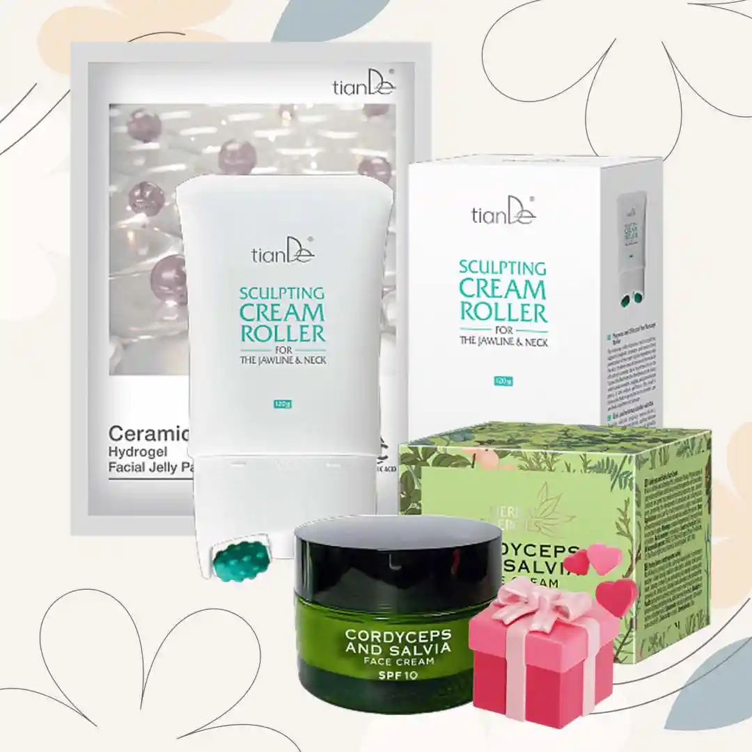 Krém s valčekom pre modelovanie kontúr brady a krku je skutočným sochárom mladosti. Účinný liftingový krém v kombinácii s masážou podporuje spevnenie V-zóny tváre, modeláciu kontúr a dokonale hladký vzhľad pleti. Na výrazné a hlbšie vrásky použite hydrogélové pleťové vankúšiky-želé. Pri nákupe tohto dua získate ako darček krém na tvár s cordycepsom a šalviou pre intenzívnu hydratáciu a ochranu pred fotostarnutím.