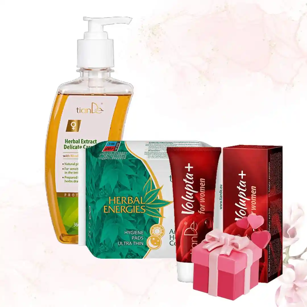 Balíček intímnej starostlivosti tianDe prináša komplexnú prírodnú ochranu a pohodlie každej žene. Kombinuje jemný intímny gél s liečivými bylinami, bylinné menštruačné vložky s úľavou od nepríjemných pocitov a revolučný intímny gél Volupta+ s L-arginínom, ktorý sa stará o intímnu mikroflóru a prirodzenú vitalitu.